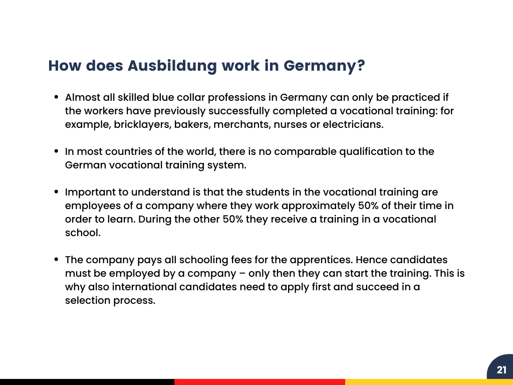 Text discussing how vocational training (Ausbildung) works in Germany, detailing requirements, the balance of practical and school training, and that companies pay fees. Emphasizes uniqueness of the system and the need for international candidates to