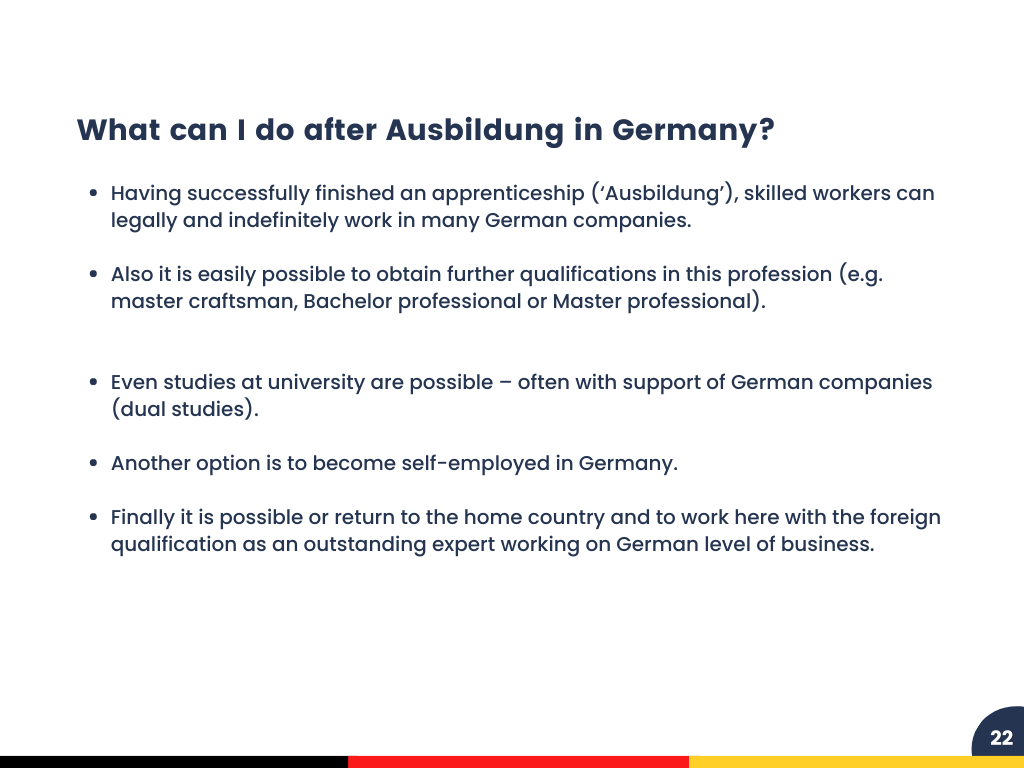 Slide titled "What can I do after Ausbildung in Germany?" lists options for skilled workers: work in German companies, obtain further qualifications, pursue university studies, become self-employed, or work abroad with German qualifications.